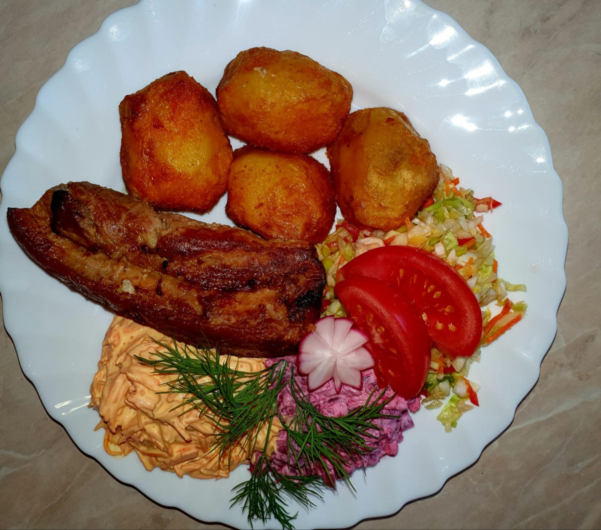 1.Vārīti cepti kartupeļi ar cepeškrāsnī ceptu cūkas krūtiņu un salātiem.