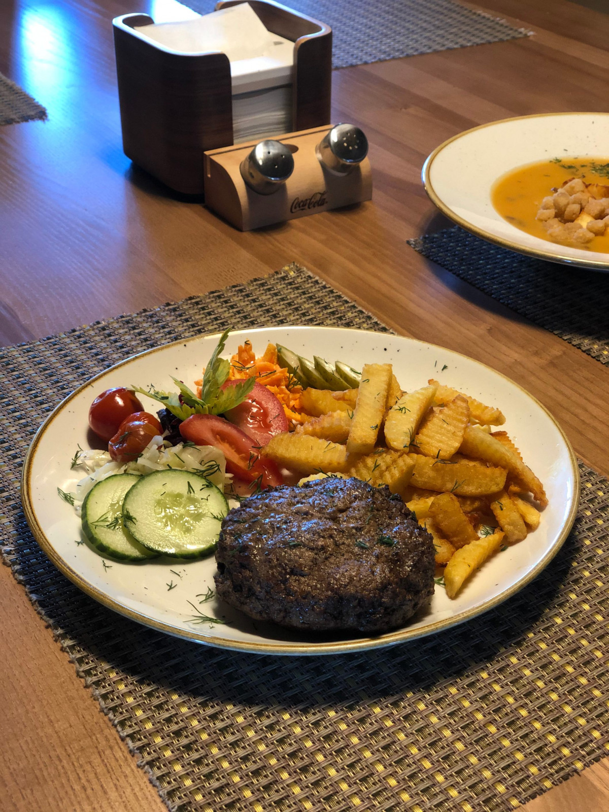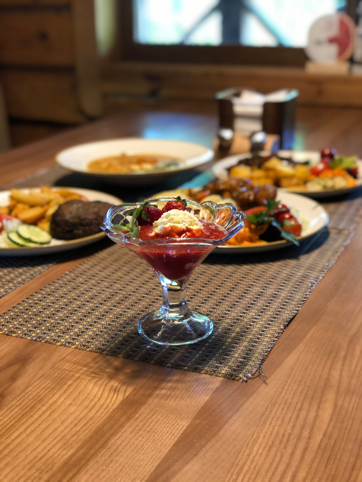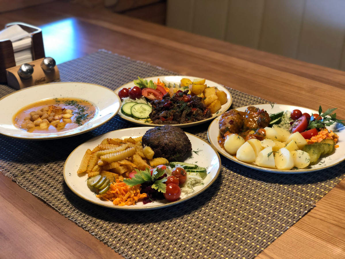 Mēs piedāvājam dažādus ēdienus, kuru gatavošanā izmantojam Latvijā bioloģiski audzētu gaļu un bioloģiski gatavotu sieru, kā piemēram Liellopa bifšteks, liellopa sacepiens ar papriku un sīpoliem, jēra gaļas kotletes, dārzeņu krēmzupa ar ceptu lauku sieru. Bioloģiska gaļa nozīmē to, ka lopiņš ir ēdis zaļu zāli vai bioloģiski audzētu lopbarību un dzīvojis svaigā gaisā. Bioloģiska gaļa ir tīra un liesāka un tai piemīt lieliska bagātīga garša! Saldais ēdiens biezpiena krēms ar zemeņu mērci, kuru gatavojot izmantots tikai Latvijā iegūts biezpiens un audzētas zemenes.