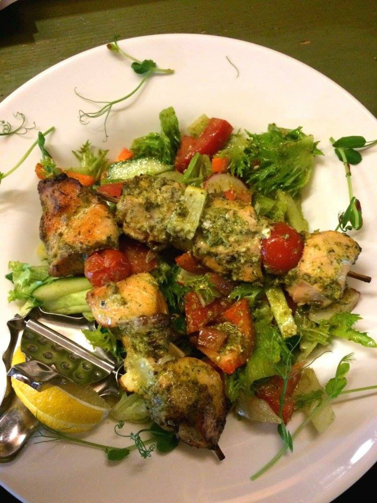 1) Svaigu dārzeņu salāti ar pesto mērci un svaigā siera bumbām;
