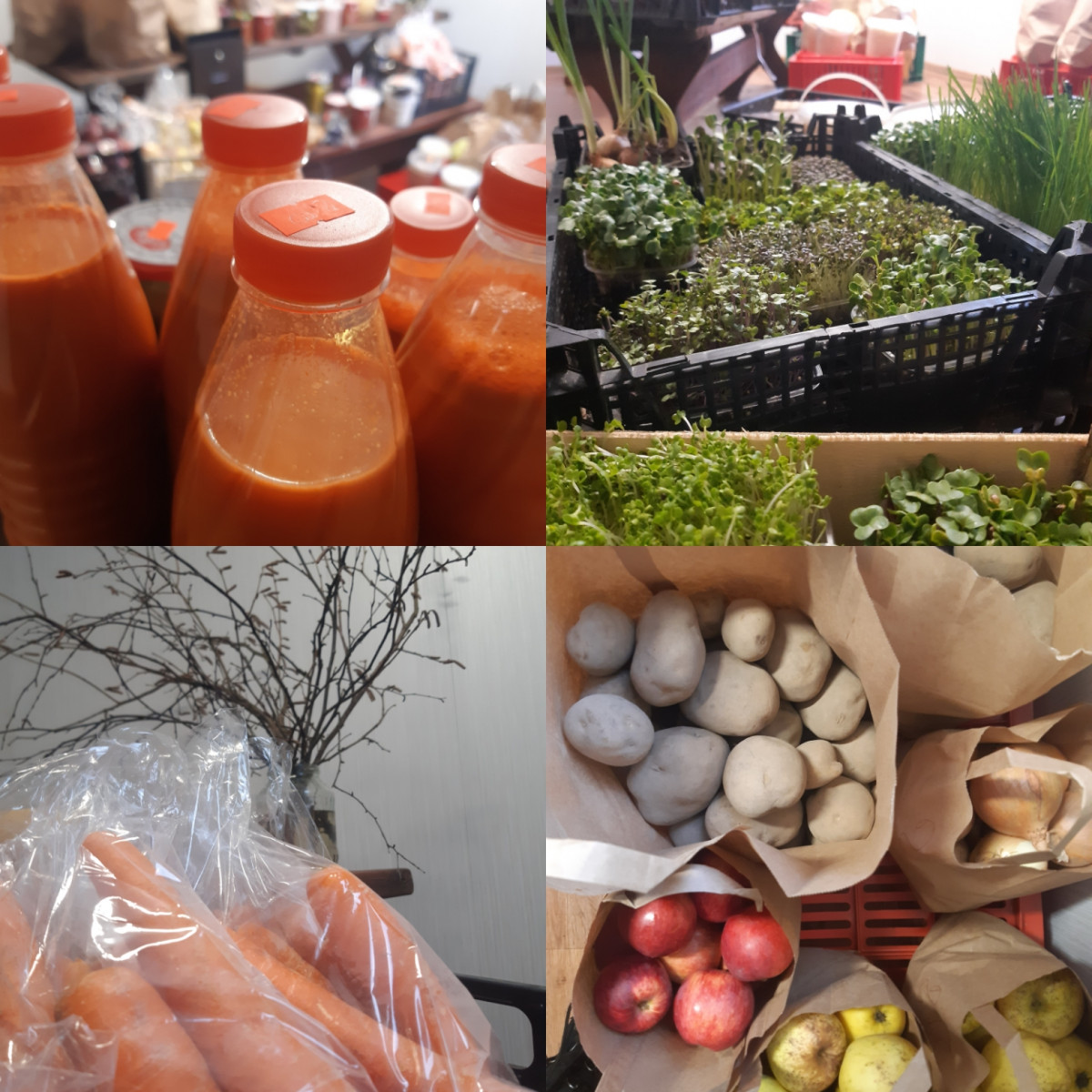 Piedāvājumā ir arī augļi un dārzeņi: kartupeļi, sīpoli, burkàni, dažādi zaļumi un mikrozaļumi, āboli, bumbieri, kā arī dabīgi gardumi un daudz citi produkti.