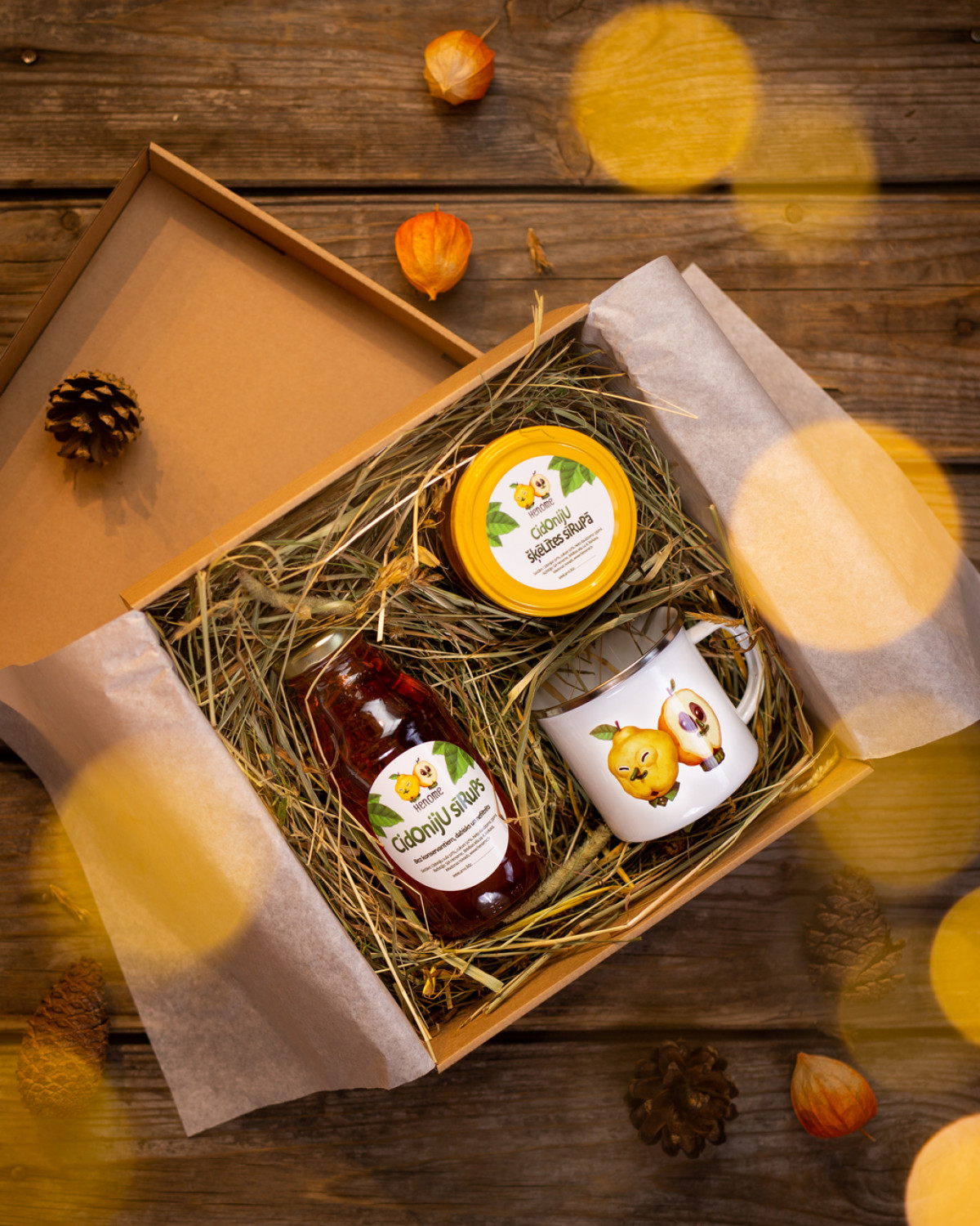 Pēc izvēles dāvanu iepakojumā tiek sakomplektēti 3 cidoniju produkti