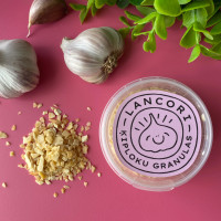 Ķiploku granulas vidēja rupjuma 200 gramu dabai draudzīgajā ZIP iepakojumā. Iepakojums ļaus ilglaicīgi saglabāt ķiploka stipro garšu. Ķiploku izmantošanai nav robežu – tos pievieno visam, kam, tavupr